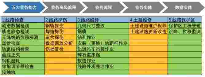 在轨道运维业务中,,,,,,,,,,,,,我们形成了完整的从业务能力(业务域)-业务流程-业务实体-数据模型的分析梳理过程。。。。。。。。。。。轨道运维业务能力如下图所示::::::
